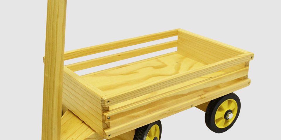 Solid pine wood construction and coated in non-toxic clear lacquer paint. Comes with durable wheels.